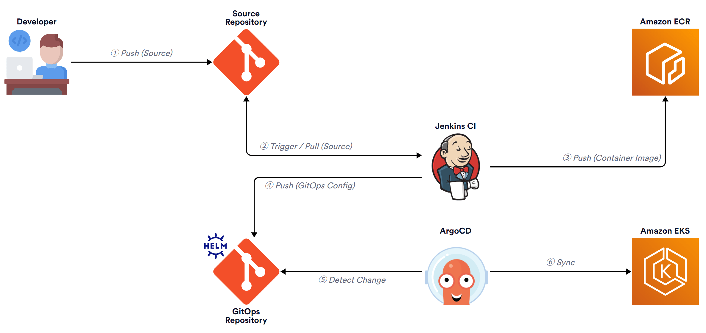 그림에는 표현되어있지 않지만 IaC(Infrastructure as Code)를 활용해서 Amazon EKS(Elastic Kubernetes Service) 클러스터가 생성되어있는데 이때는 Terraform이 사용되었다. - ArgoCD에서 Config Repository에 의도된 상태와 현재 상태의 차이를 감지한다.
