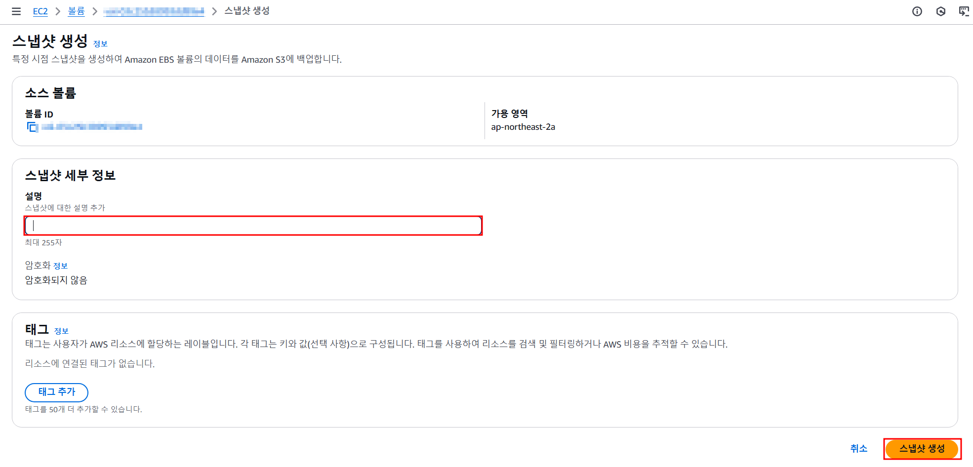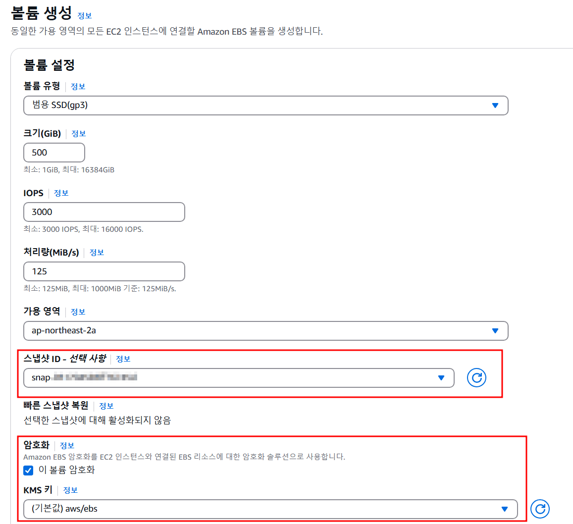 데이터 복원을 위해서 생성된 스냅샷 ID를 선택해주고 우리의 목표인 볼륨 암호화를 꼭 체크해준다.
