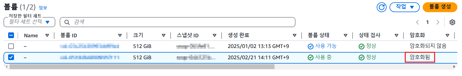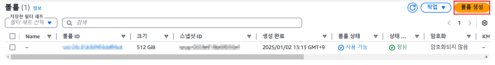 스냅샷의 생성이 완료되었다면 해당 스냅샷을 이용해서 암호화된 볼륨을 생성할 차례이다.