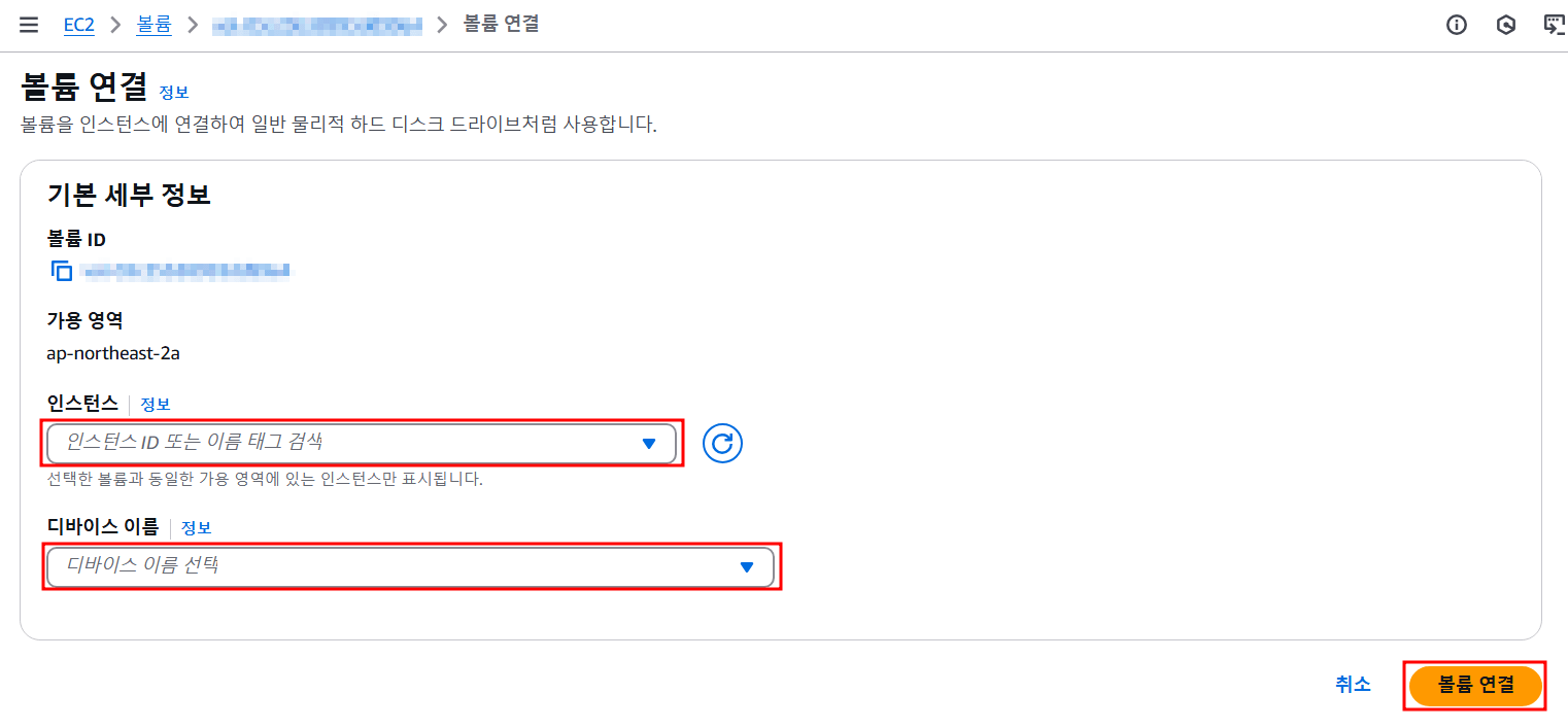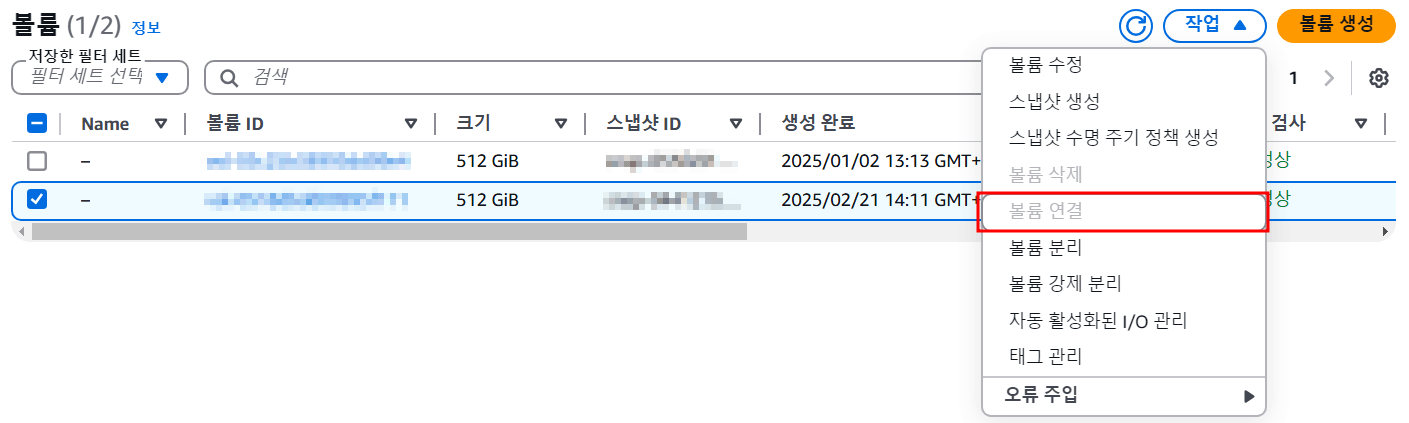 거의 마지막까지 왔는데 이 단계에서는 지금까지 생성한 암호화된 EBS 볼륨을 기존 EC2에 연결해준다. (필자는 연결 후에 화면을 캡쳐해서 '볼륨 연결'이 비활성화 되어있다.)