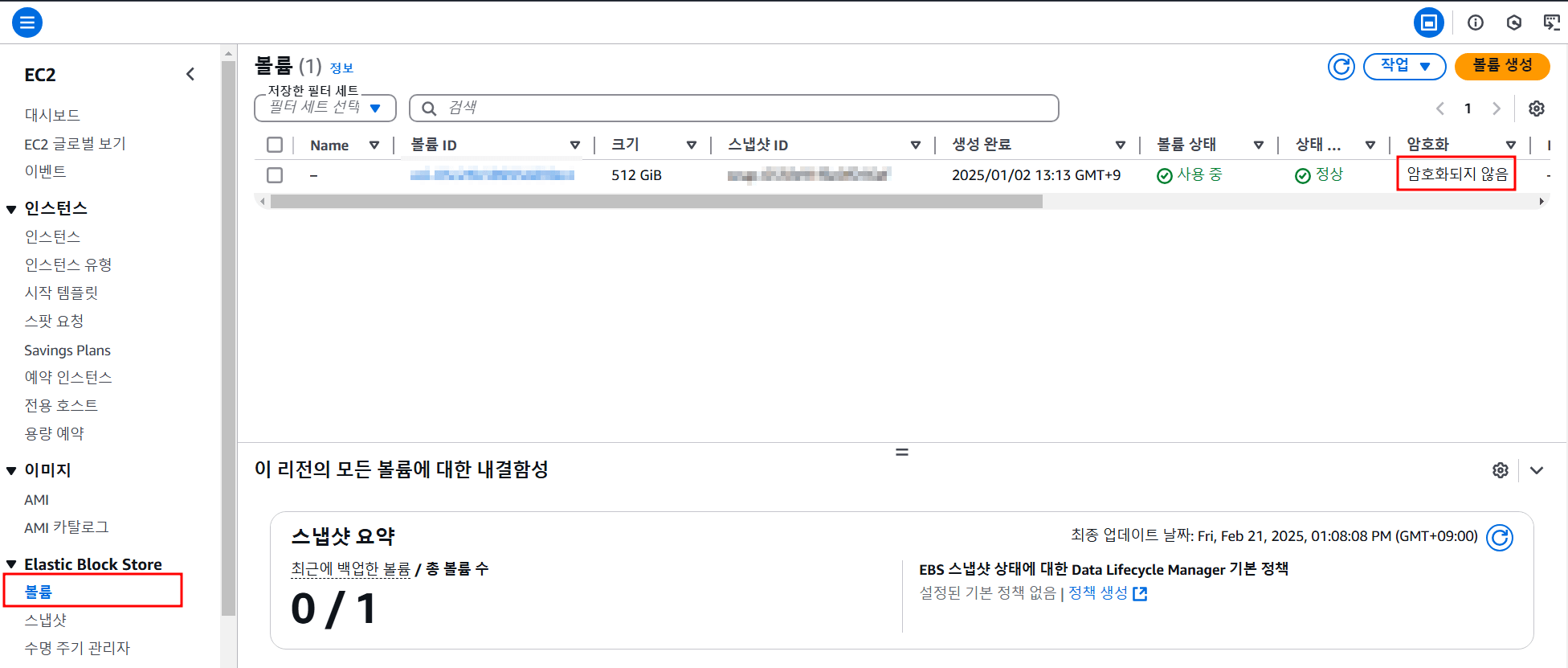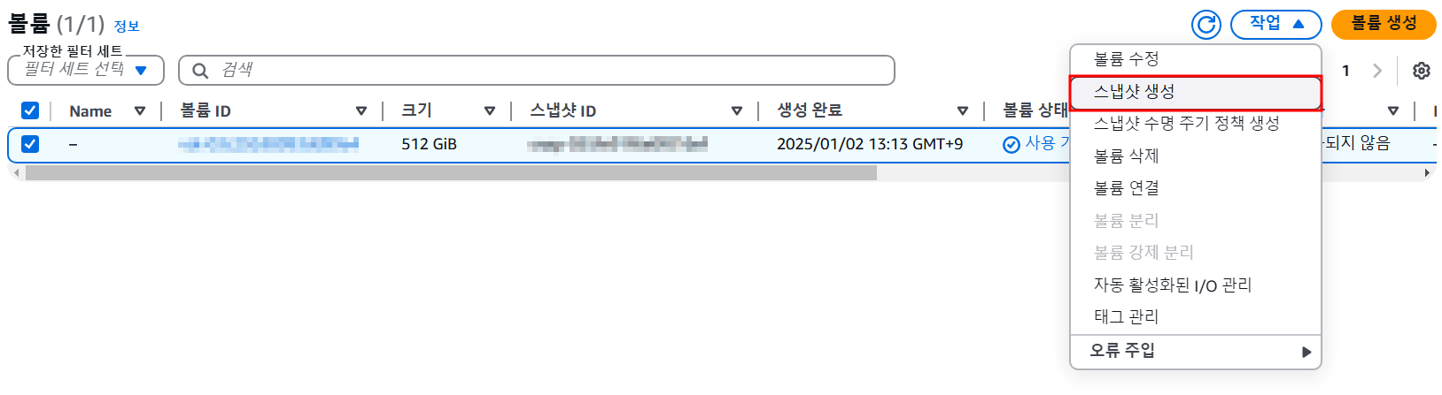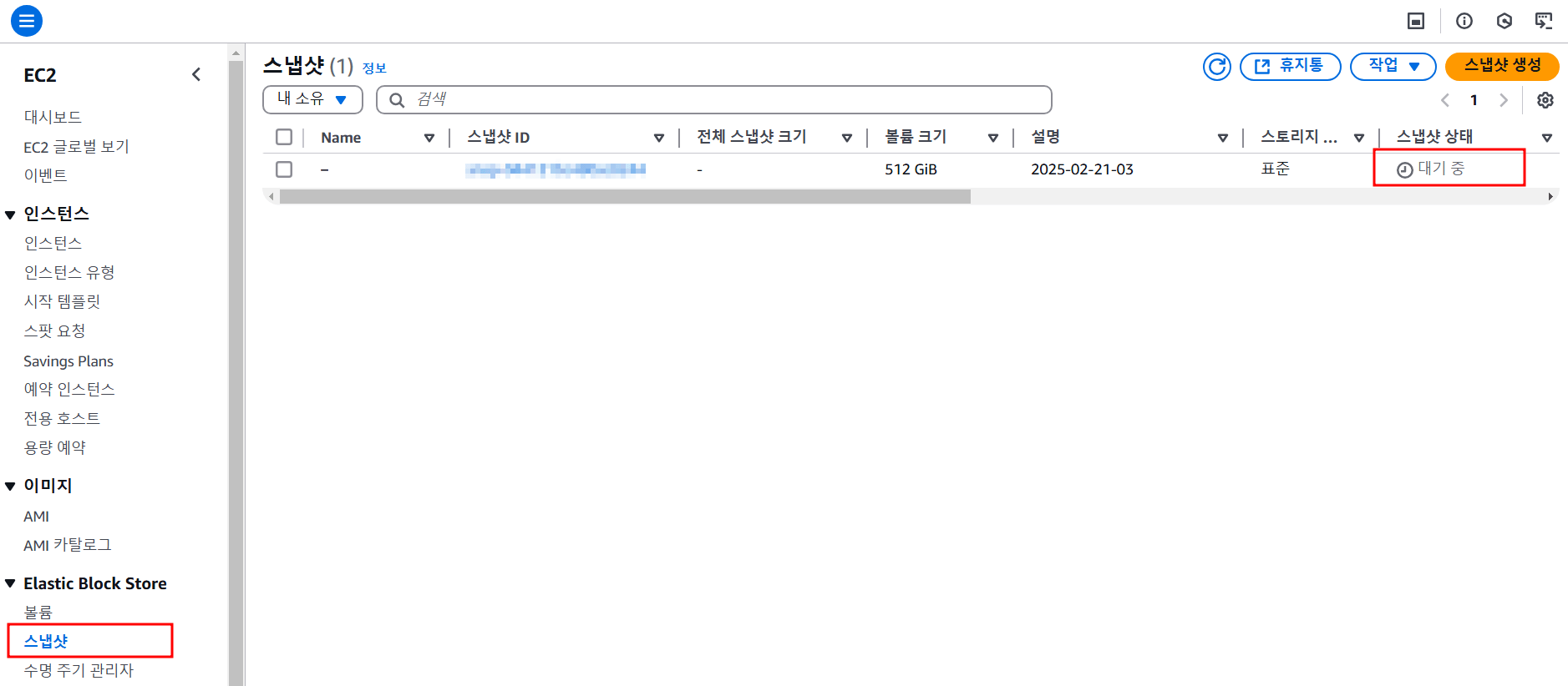 스냅샷 화면에서 생성된 스냅샷을 확인 할 수 있고 스냅샷의 상태가 '완료됨'으로 표시되어야 다음 단계로 넘어갈 수 있다. 필자는 512GB의 볼륨의 스냅샷을 생성하는데 거의 2시간이 소요된 것 같다.