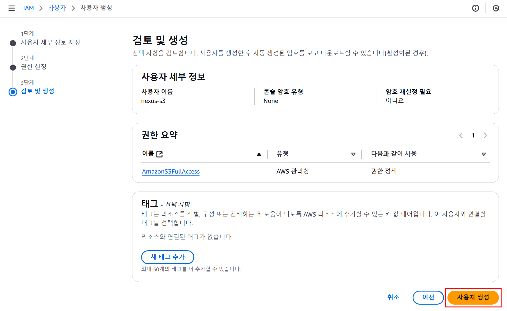 넥서스 관리 페이지에서 입력한 이름의 S3 Bucket이 생성된걸 확인 할 수 있다