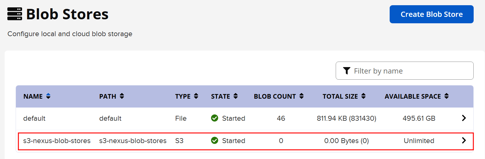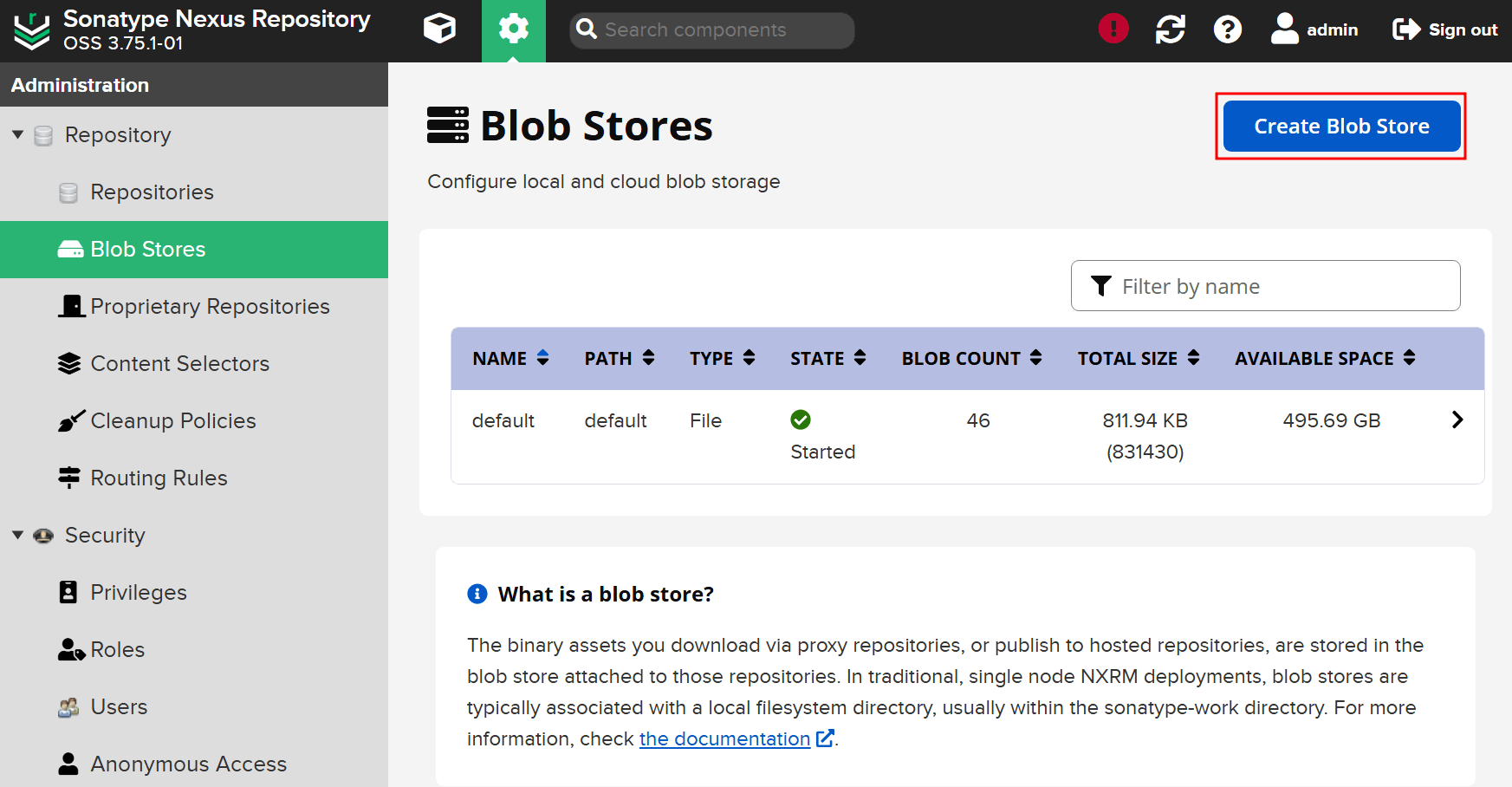관리계정으로 로그인 후 ⚙️ 화면으로 들어가서 Blob Stores ➡ Create Blob Store 클릭