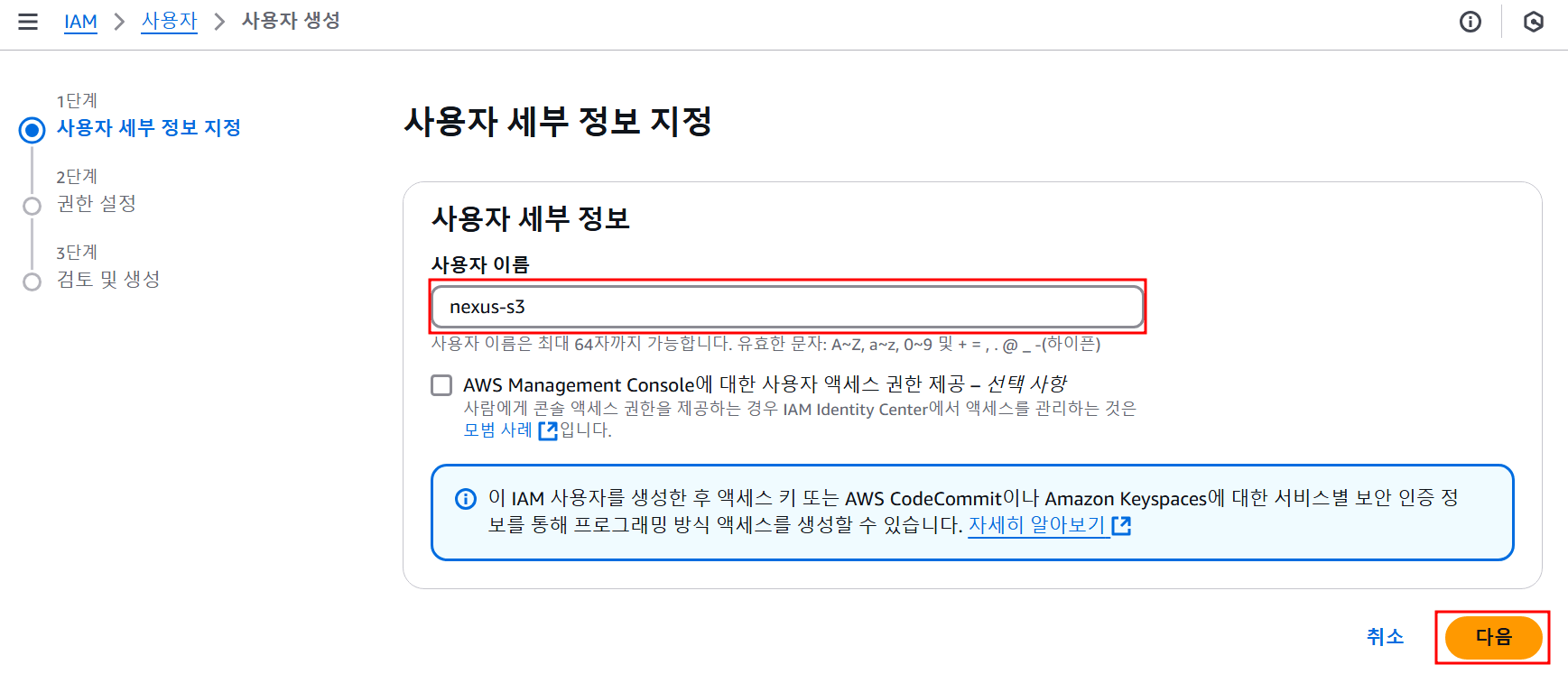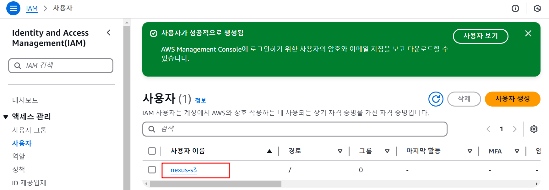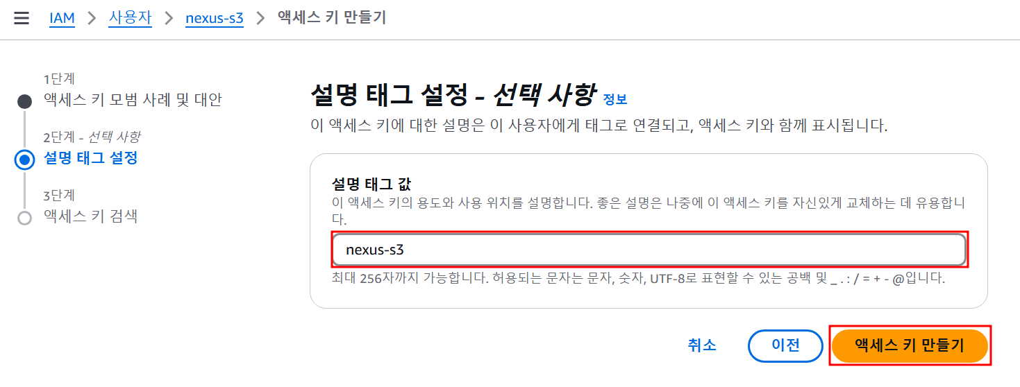 이 단계에서는 S3에 Access 할 수 있는 권한 사용자를 생성하고 Nexus 연동을 위한 AccessKey를 발급받는다.