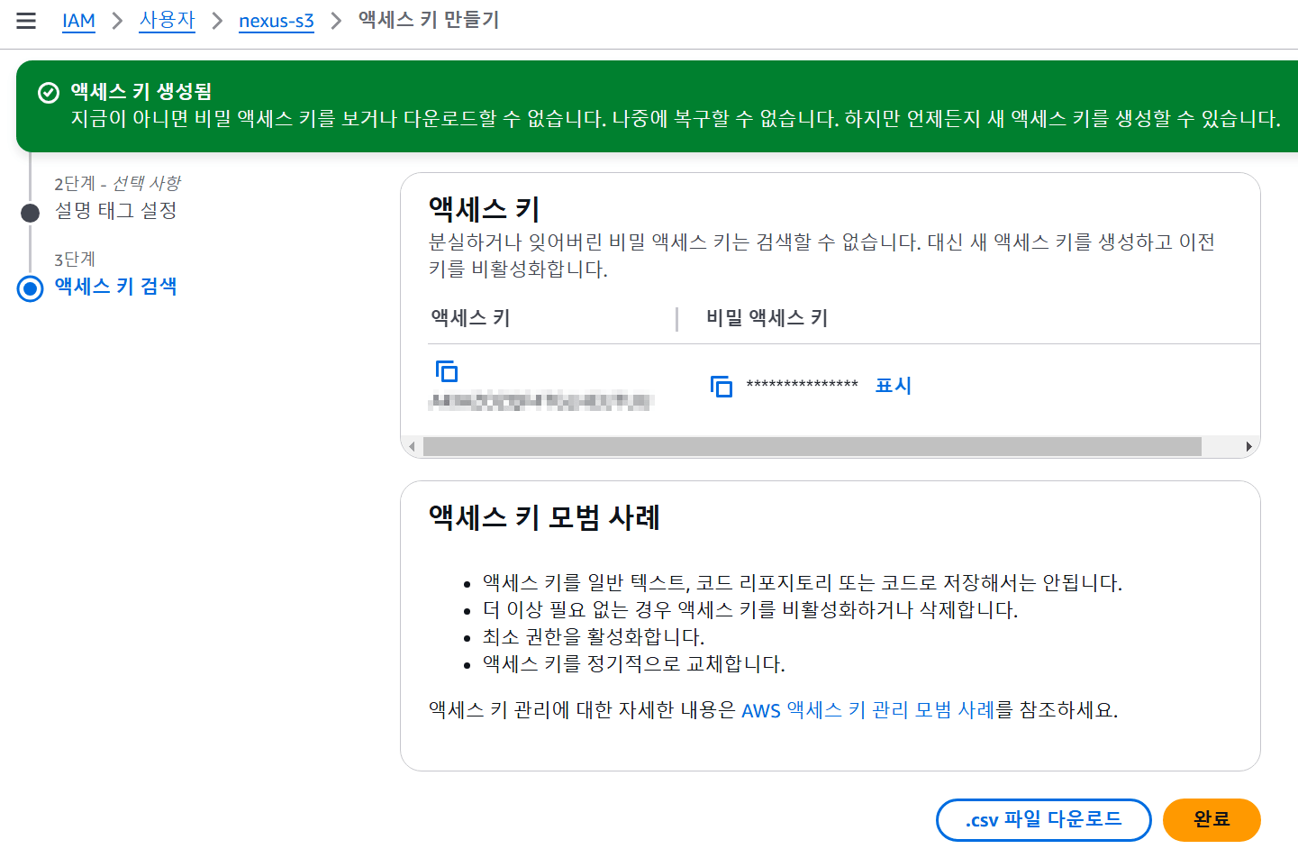아래 화면과 같이 액세스키가 출력되는데 csv 파일로 다운로드하거나 키를 저장해두어야 한다