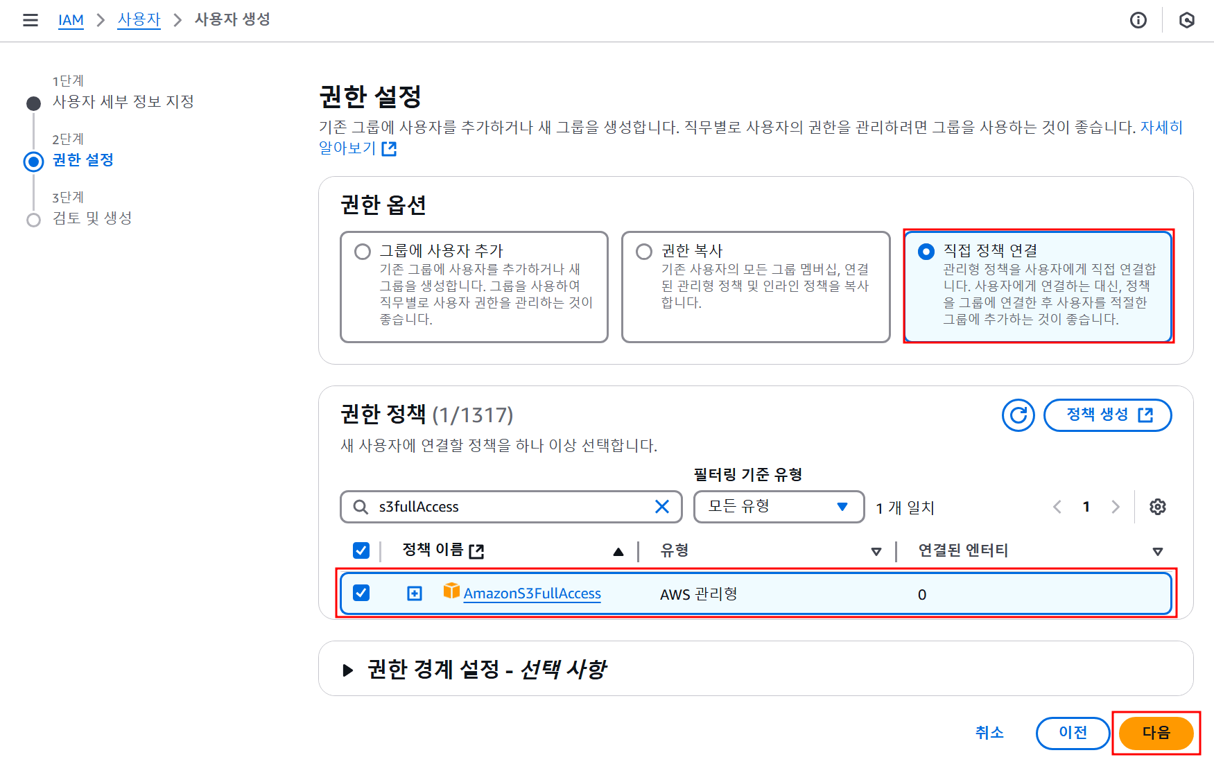 직접 정책 연결로 선택하고 권한 정책에는AmazonS3FullAccesss정책을 선택한다 -
