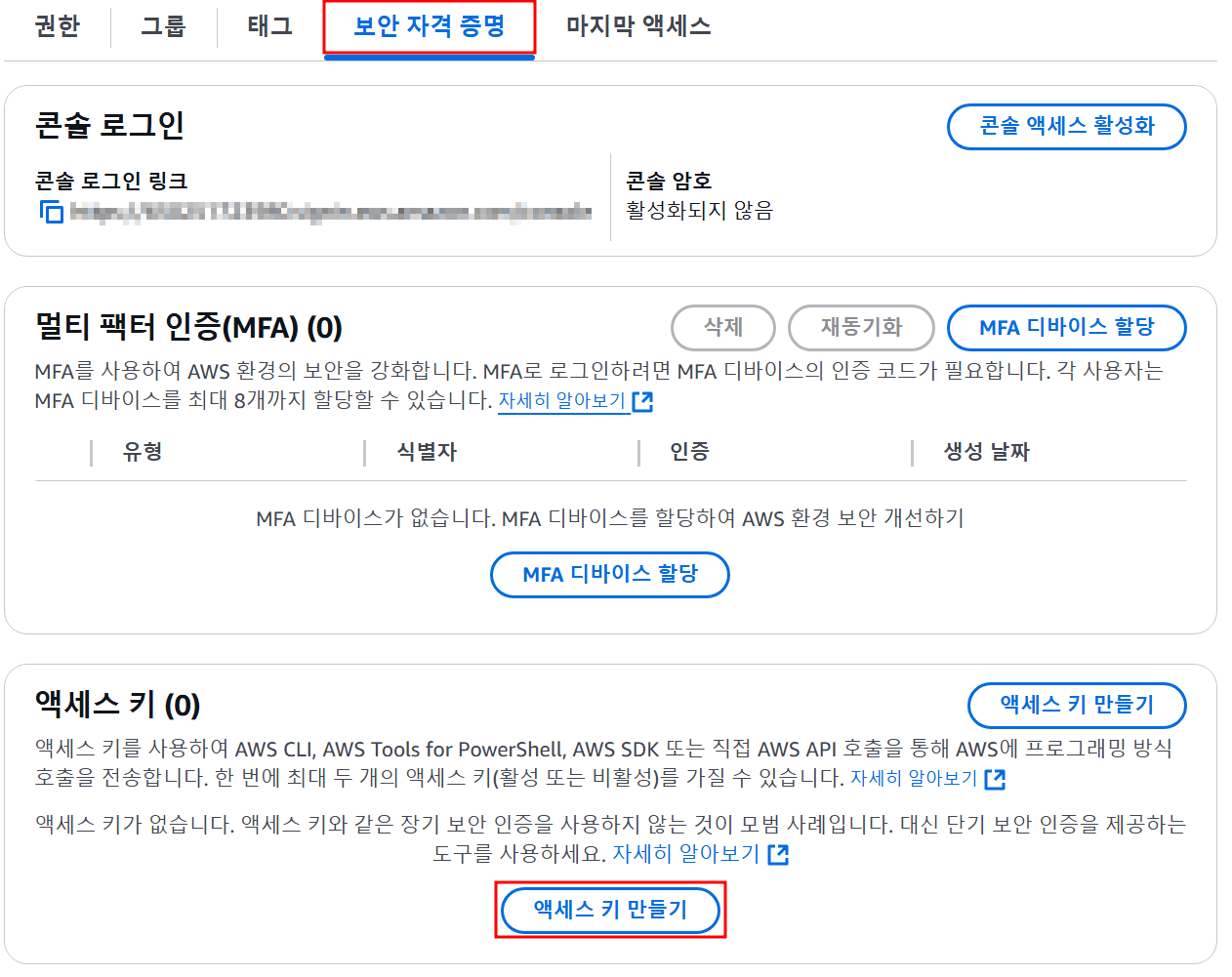 보안 자격 증명탭에서액세스 키 만들기를 선택 -